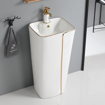 Lavabo cuadrado de cerámica blanca montado en el suelo moderno dorado, fregadero de pedestal de cerámica de un solo orificio para Hotel